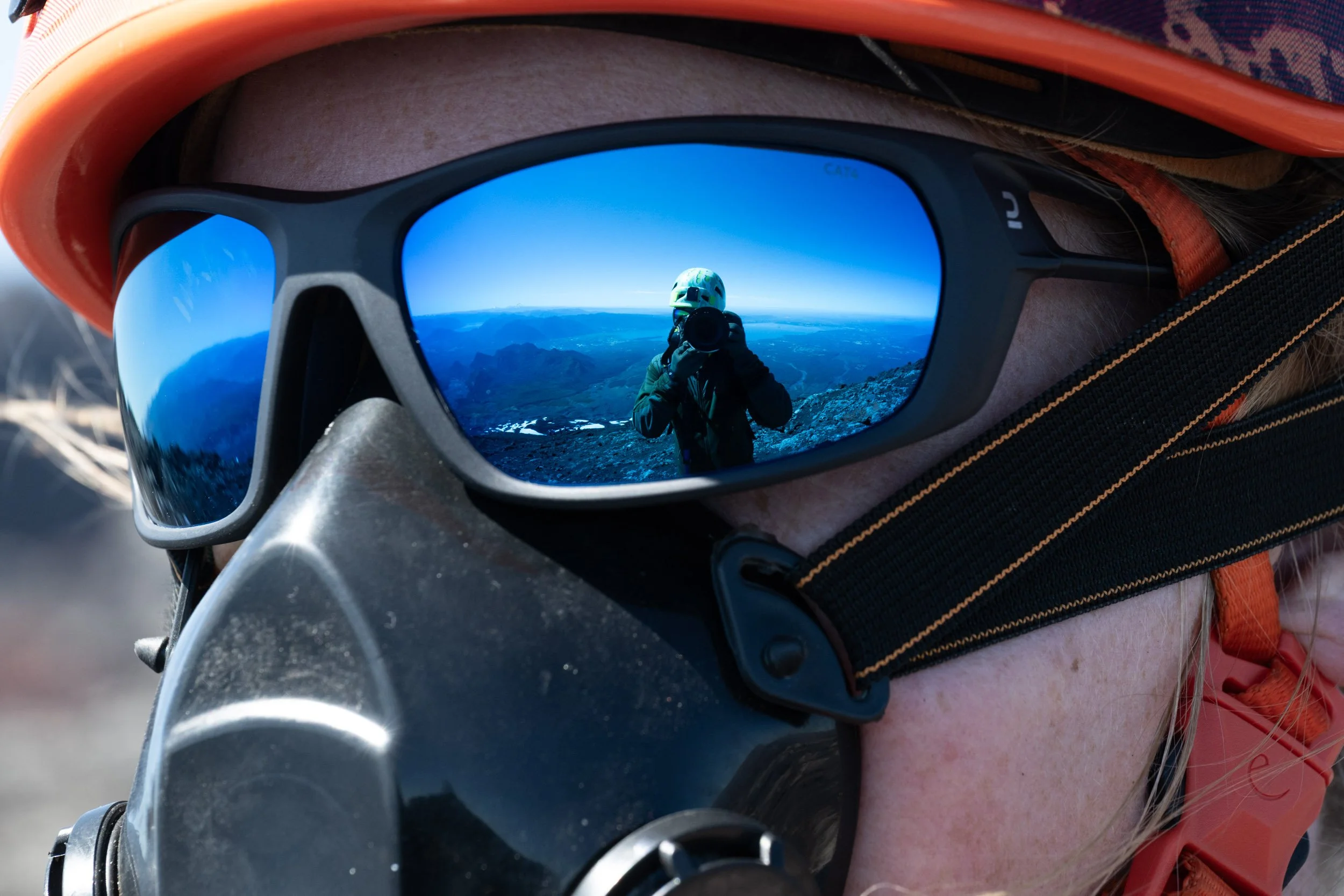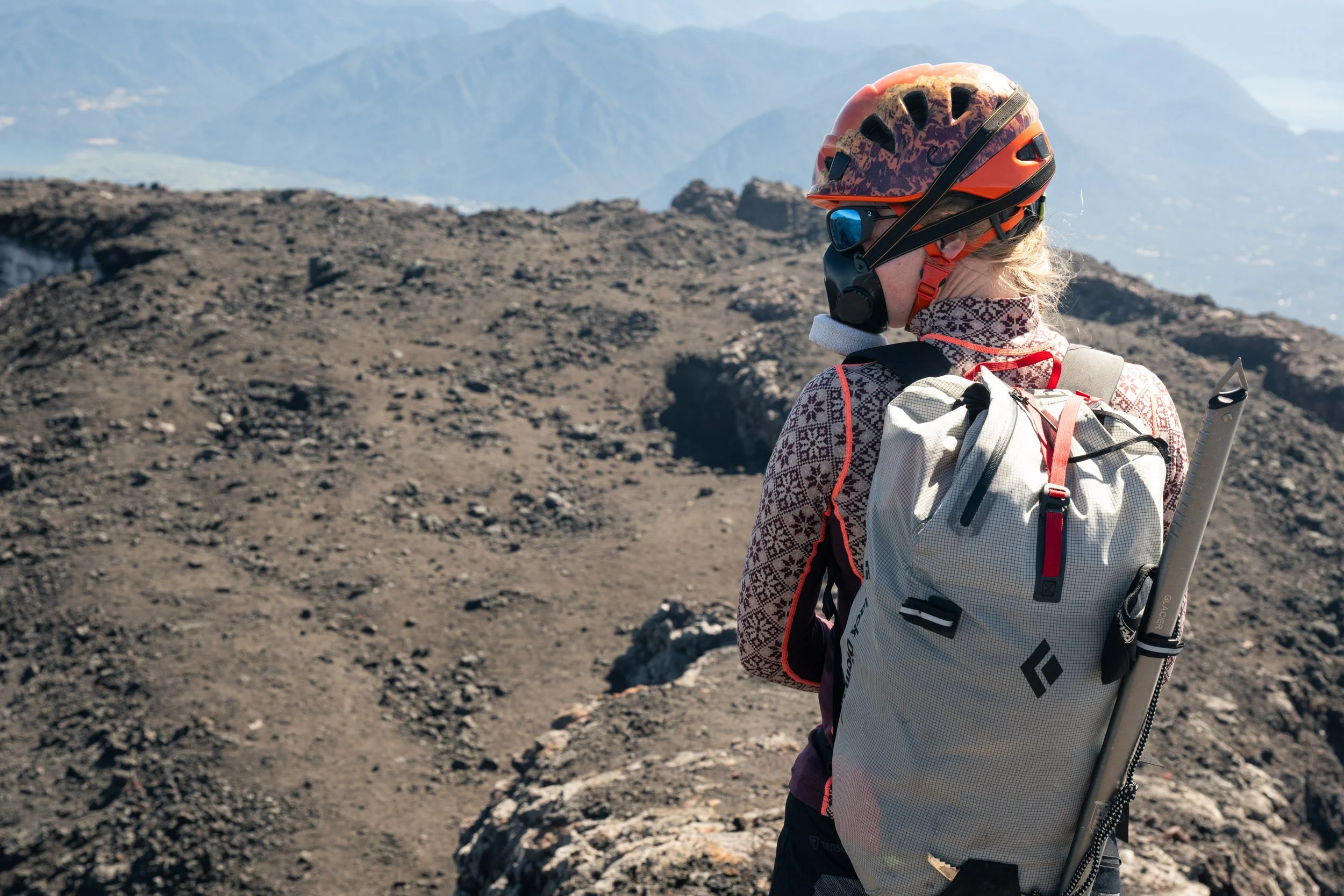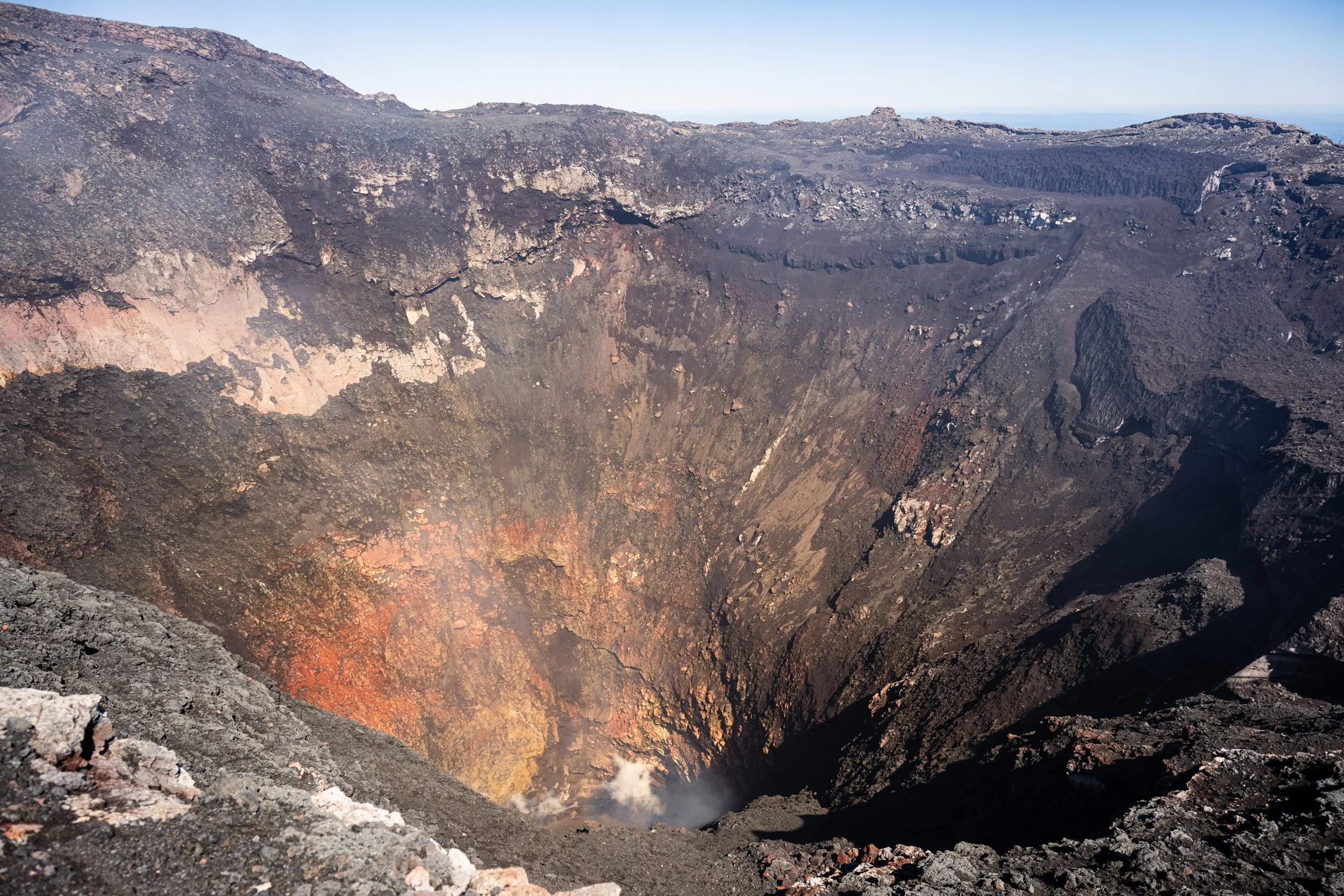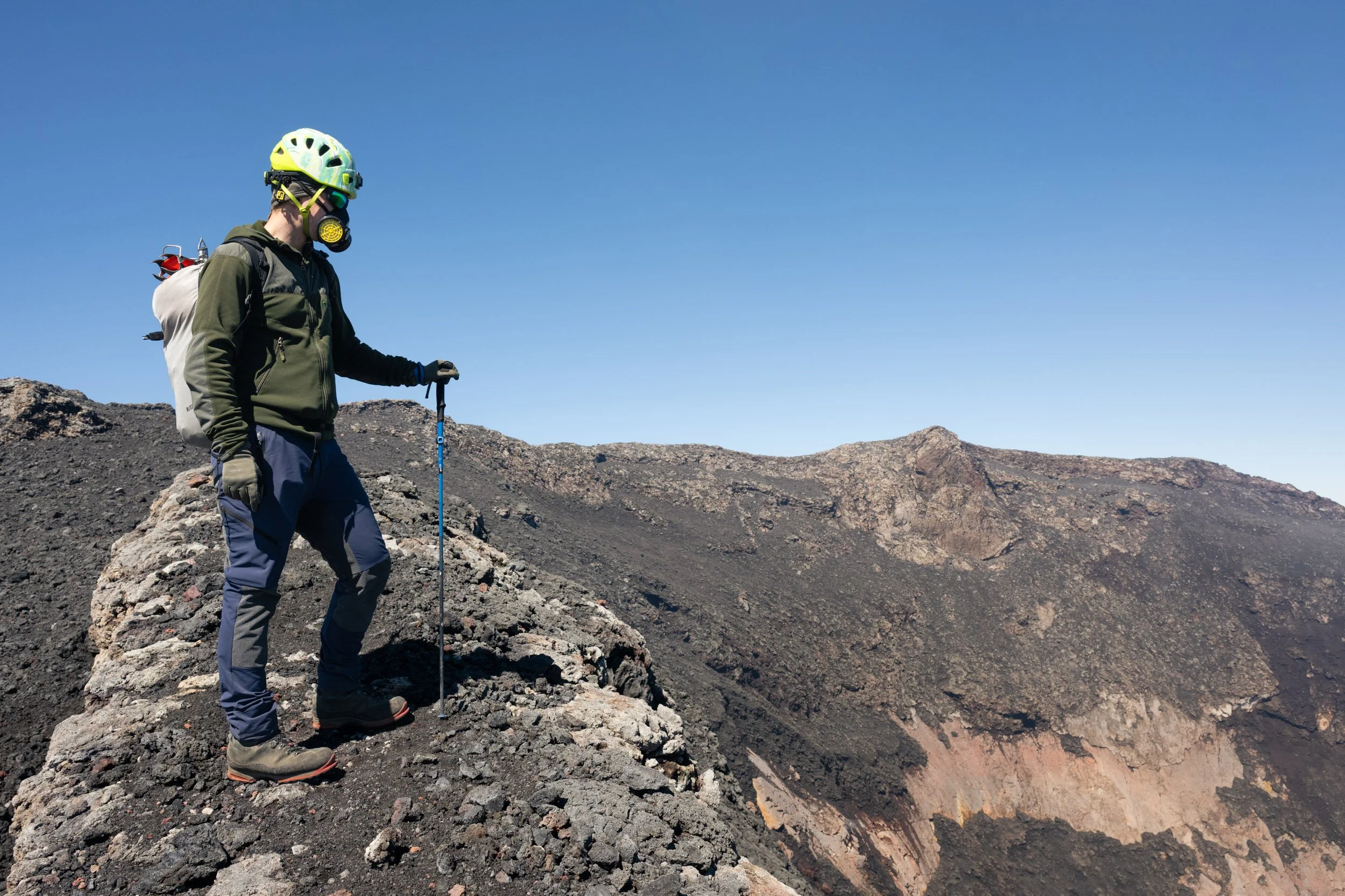 In places where the snow has melted away, you end up fighting your way through loose, ultra-fine volcanic sand. Without a doubt, this is the physically hardest part of this climb. For every two steps up, you slide down one and a half. In the loose sand, old tracks disappear almost instantly, which means that you need to stay sharp in order not to get too much off course. After you’ve crossed the final snowfield, you get to the final section just below the summit ridge. From here, there’s another 100 vertical metres until you reach the side of the crater. The top section is dominated by exposed solidified lava. Razor sharp rock with a deep black colour, speckled with shining crystals. As you approach the crater, the smell of sulphur dioxide intensifies. Even with the wind blowing in the other direction, you smell the sulphur. A clear sign that it’s about time to put your gas mask on. With our gas masks on, we made our way up the last few metres until we were on the edge of the crater. It’s striking how impressive and scary a volcano can be. The inside of the crater is multiple hundreds of metres deep. Getting out of there if you fall in seems like an almost impossible task.