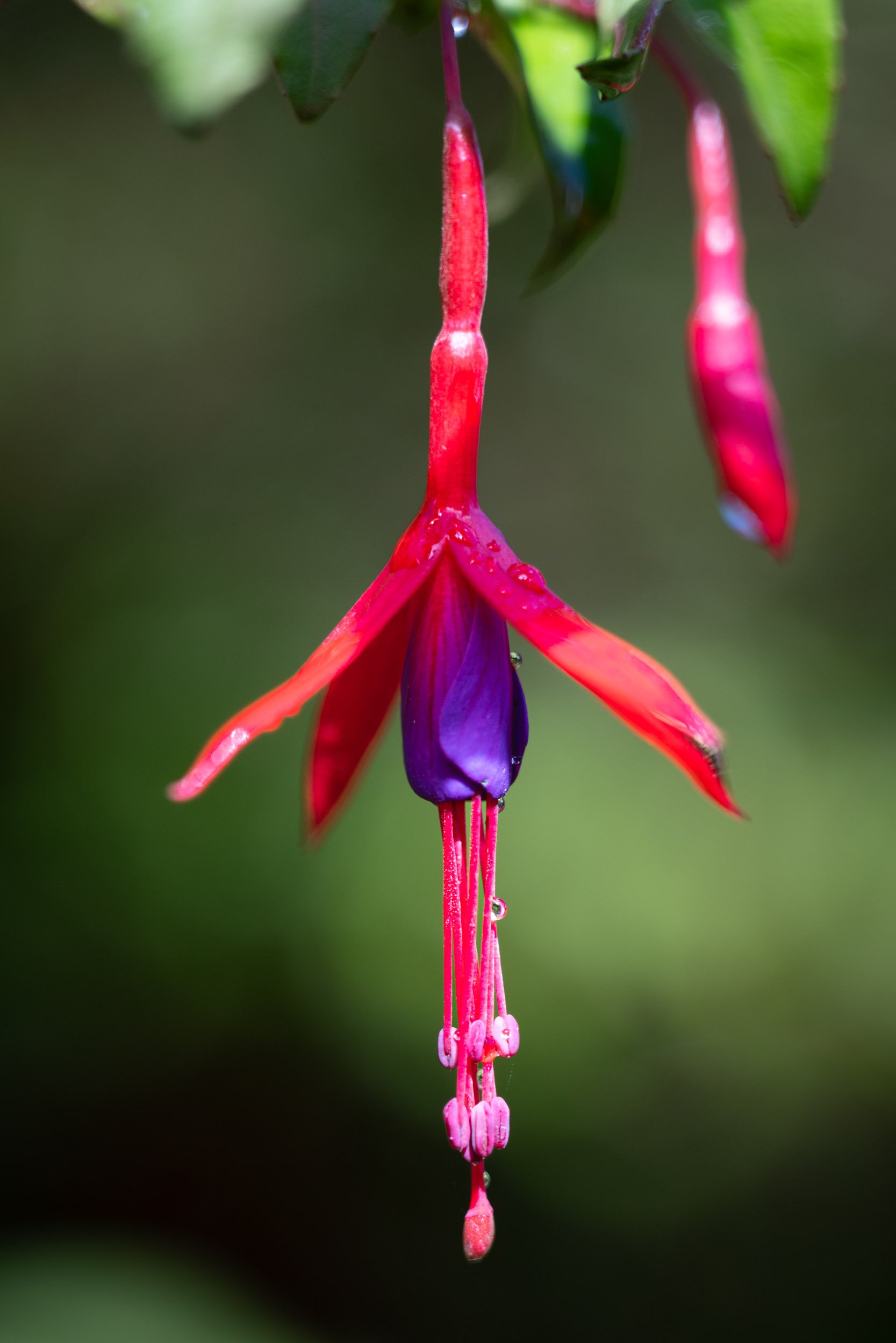 After a humid night, delicate water droplets cling to the petals of a beautiful Fuchsia magellanica, also known as the Chilco.