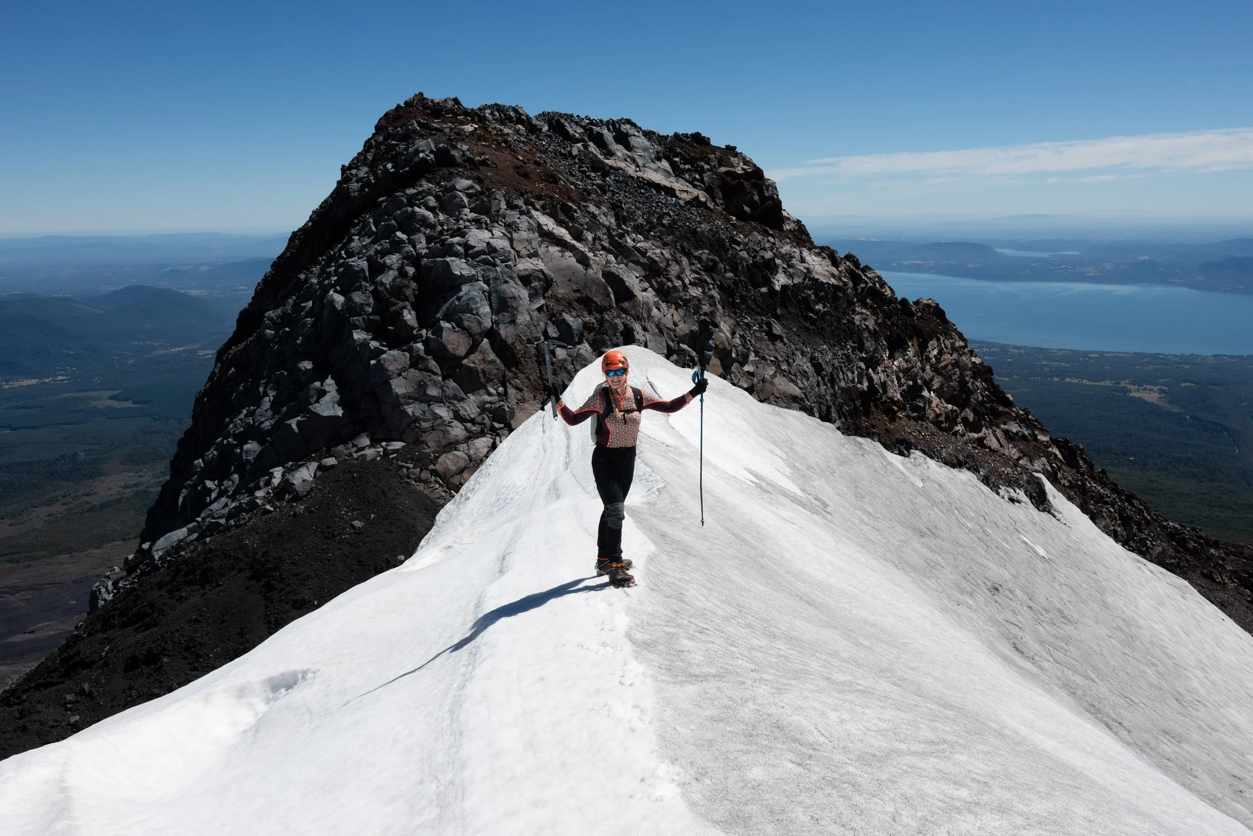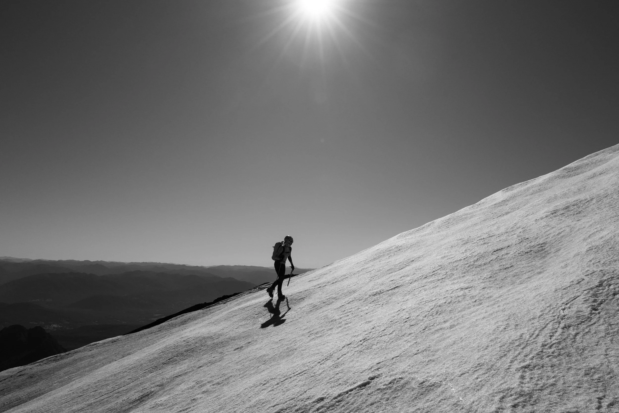 From the top of the rock section, the third and final section of the climb starts. This part traverses the ridge towards the summit. The climb is a mix of scrambling through rock and navigating the occasional snow field. The technical nature and the level of exposure varies greatly on this section of the climb. In some places it’s walking over rocky terrain. In others, it’s crossing steep snow fields while looking straight into the abyss. Talk about pushing the boundaries of the comfort zone.