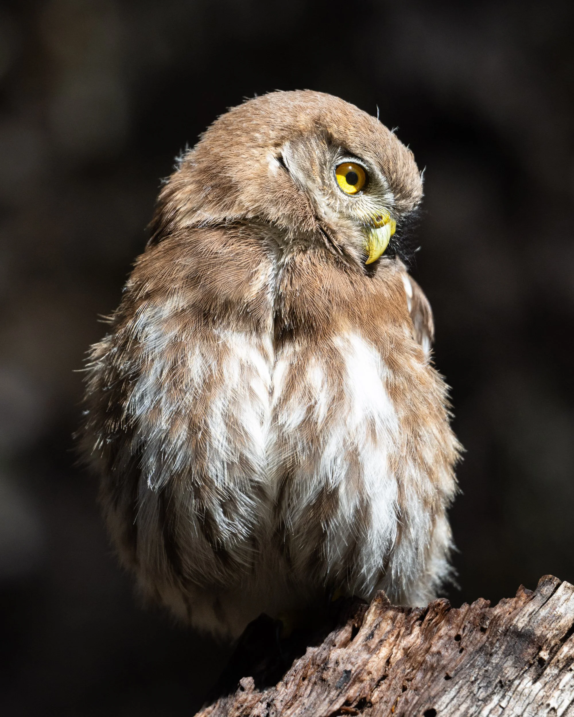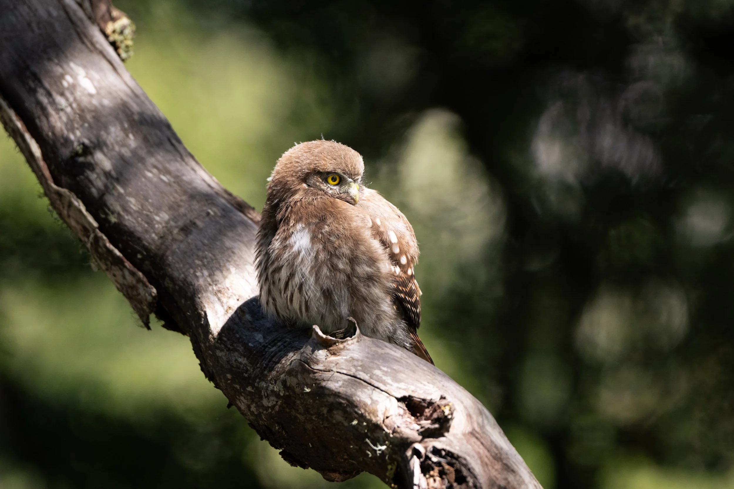 As we made our way up the tree-covered hillside, we passed through a section of particularly dense undergrowth. Fern-like plants almost taller than us. The air was humid, filled with the distinct sweet smell of decaying organic material. A large tree had fallen over and had created a small clearing. Right there, sitting on a larger branch splitting off from the trunk of the tree, was a small greyish owl with the most striking yellow eyes. The kind of yellow that can pierce through even the thickest undergrowth. Unsure how long this moment would last, I started shooting away. Lots of pictures. Loosely referencing Paul Nicklen, arguably the most influential wildlife photographer of his generation, first, make sure you get a picture to document what you’ve just seen. Once that’s done, you can start being creative and work to create visually powerful images. I always try to keep that in mind. After a minute, a second owl landed on the ground next to the fallen tree. With their small size and their fearless attitude towards life, we were certain that they were juvenile owls. Sitting there, seemingly unbothered by our presence, it seemed like they were waiting for mom and dad to return with lunch. After having enjoyed watching the tiny owls jump from branch to branch, we decided it was time to give them some space. Confident that I’d gotten a decent photo, we set off.