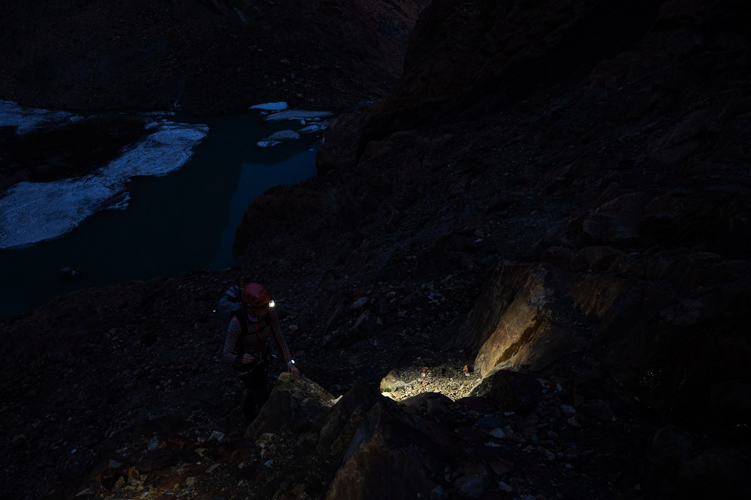 After about an hour and a half navigating through the moraine we had made it to our high camp. Luckily we weren’t the only ones who had ever thought of sleep here. Along with a small but surprisingly straight patch of dirt was a tiny stone wall, built to offer protection against the wind. After a bit of manoeuvring and some digging we managed to pitch our tent. We knew from the forecast that the strong winds would stay until around midnight so we decided expand on the stone wall. Hard work but worthwhile.